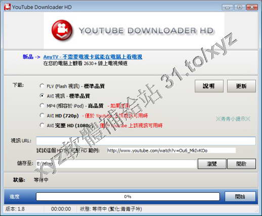 Youtube Downloader HD v1.8 繁體中文正式版(可下載 Youtube 等 網站影片,儲存為 flv 、avi 或 mp4 等格式的工具軟體)